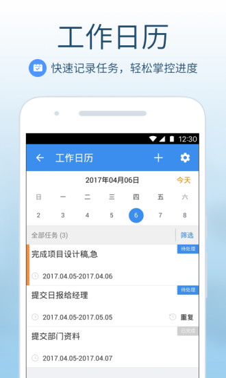 8、工作日历:工作任务快速记录,上级随时随地查看下级进度,一人创建任务,多人共享,重要任务标亮显示;