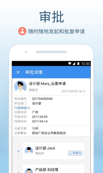 14、管理:随时掌控审批、签到等统计数据,轻松进行权限管理。