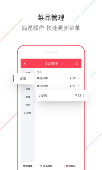 5、菜品管理:菜品类别个性设置,名称价格一一对应;