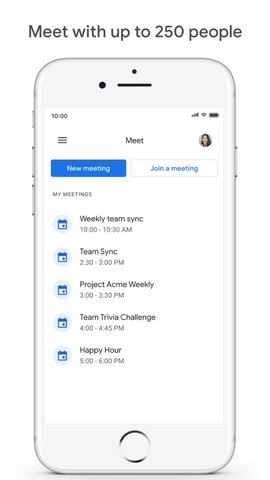 在合作方面,我们有着很多问题都需要共同解决,但有时候因为太忙没有办法统一聚到一起。但视频会议,什么有效,google meetAPP是一款非常好用的谷歌视频会议软件!这款软件能够实现同时让30个人进行视频会议,功能非常的强大,让大家使用手机也能轻松办公!最多可容纳250位参与者进行超清晰的视频会议,感兴趣的朋友快来下载体验吧!