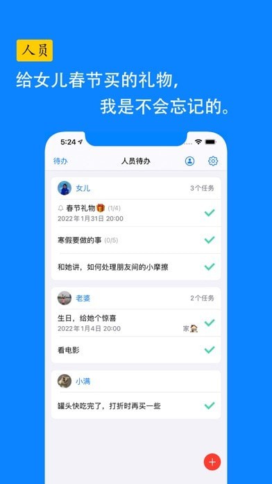 比如说您的孩子,暑假要去儿童乐园玩、看电影、参加同学的生日派对;您的朋友说很久没有一起吃饭了;您的同事借了您的几本书。这些林林总总的事情,通过查看每个人的待办列表,就可以清清楚楚。