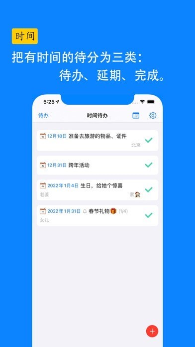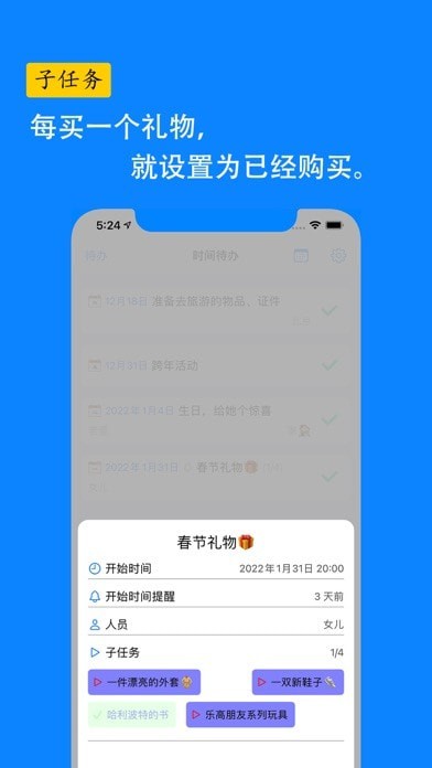 有些事情会比较复杂、或内容很多,比如小朋友开学前要买很多学习用品。我们可以把这件事情拆分为多个子任务,每买一个用品,就设置对应的子任务为完成状态。