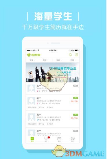2、青聘果基于移动互联网技术开发,能够提供各类智能终端和PC接入,为高等院校就业指导中心、毕业生、招聘企业提供更全面的服务;