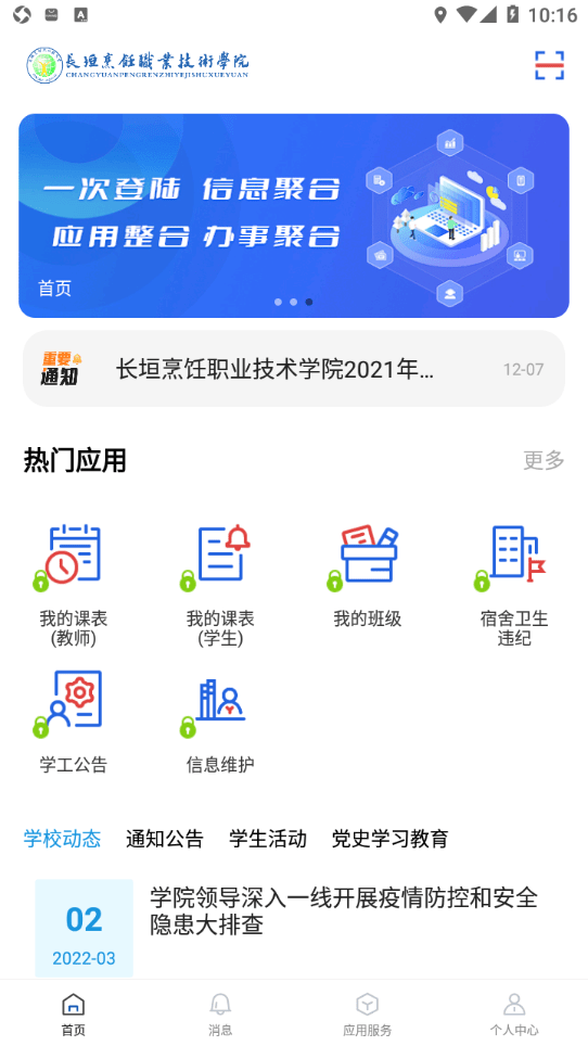 云上烹院APP是通过对新闻,应用,消息的集成,为校领导,教职工,学生等角色提供统一的服务入口,是在长垣烹饪职业技术学院智慧校园的基础上对智慧校园的重要功能模块进行了移动化应用。