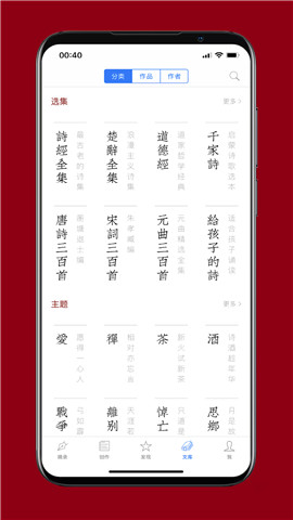 【精选分类】对100万诗词进行分类,包括:选集、主题、写景、节日、节气、词牌、时令、课本等。