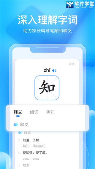 2、字词学习:同步课本内容,字词笔顺、读音、释义、组词等,由易到难,让家长轻松伴学。