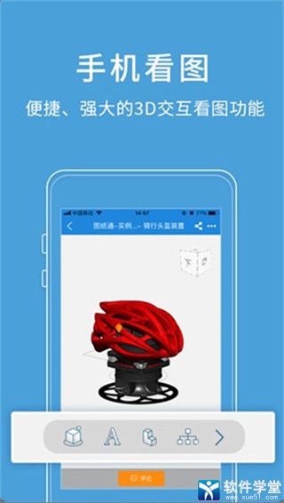 4、手机便捷看图。支持40多种3D模型、CAD图纸的手机在线浏览,可以直接打开查看微信、QQ、钉钉、企业微信中接收到的图纸。支持SolidWorks、Creo、STEP、IGES、STL、DWG等。