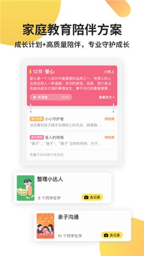 根据3-6岁孩子的发展特点,提供专业的家庭陪伴方案,每周一个活动,涵盖人际交往、情绪管理、习惯养成等各方面,全方位关注宝贝成长;