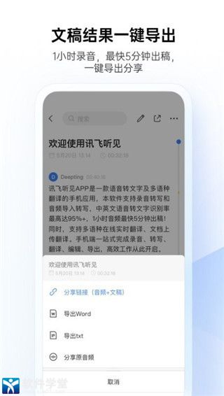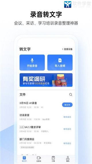 该软件是一款语音文字转换应用,软件以科大讯飞的语音识别技术为基础,可以迅速准确的将用户的语言转换成文字,方便整理还节约了时间,音频一键转文字的快速服务平台。网站以语音转文字为核心功能,提供便捷高效的机器转写服务和专业精准的人工转写服务,软件快速准确识别语音并转换成文字并自动生成文档,极大方便用户使用和提高用户工作效率,还有翻译功能,智能纠错功能等。