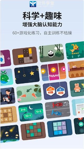 该软件是一款极具科学性的脑力锻炼软件,提供了多款益智游戏,用户可通过玩游戏来提升思维能力、记忆能力等,不断挑战防止随着年龄的增长而脑力退化,帮助大家很好的锻炼自我记忆力和专注力,平台中包含的脑力训练内容是非常多的,不同的训练内容对应的分类也是不一样的,用户们可以自由选择自己需要的内容进行体验,实时提高自己的脑力;