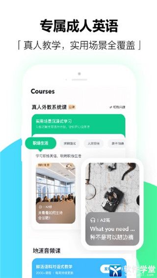 1、课程采用场景对话模式,学工作、生活中马上能用的口语。