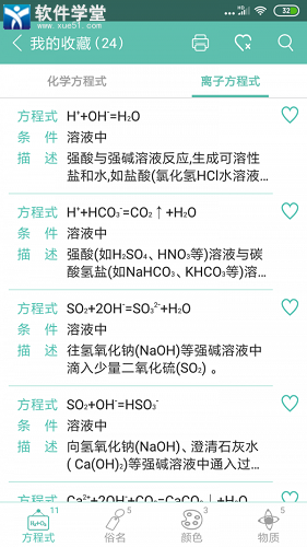 该软件一直立志于为同学们提供最便捷、最齐全的化学查询工具。经过了三年的不断完善数据,该软件以及可以满足各位初高中同学的各种要求,每种方程式的反应条件、出现的现象、生成的物质,化学键的断裂等等都会给大家讲解的一清二楚。
