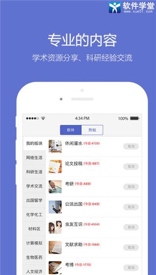 除此之外,还有基金申请、专利标准、留学出国、论文投稿、学术求助等实用内容,满足用户的不同需求。同时致力于专业研究方向,涵盖各种专业学术科研探讨、读研读博经验交流等内容,是国内唯一一款服务于各大院校硕博研究生和企业科研人员的学术科研类应用。