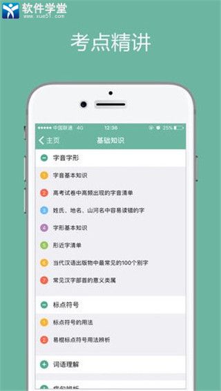 7、知识点:包含高考语文科目下的所有高考知识点详解,具体的有基础知识、文学、文言文、古诗文、现代文、写作等几个大的模块。