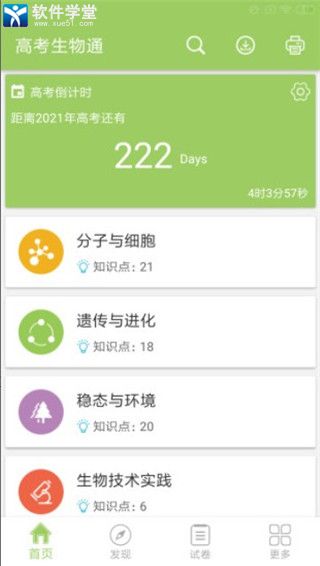 拥有这款生物学习软件,便能为大家补缺补漏,绝对非常给力!这高考生物通是一款为高考用户定制的生物学习软件。该软件包含丰富的生物学习资源内容,首页设计高考倒计时,高考生物知识点,生物试题等等,帮助用户学习。这里包含高考生物所有高考知识点,具体的有分子与细胞、遗传与进化、稳态与环境、生物技术实践、现代生物科技专题等几个大的模块,精细讲解。