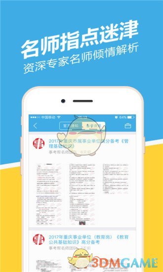 重庆事业单位考试是非常的难,想要靠近,那一定需要找到一个靠谱的平台如重庆事考帮,在里面模拟近几年的考题库,还能通过直播在线观看讲解。《重庆事考帮》是一款专为重庆事业单位考试考生打造的备考神器。海量的真题内容,各大名师的在线直播授课,帮助你轻松掌握所有知识点,快速的通过考试,再也不用为不知道如何备考而发愁。