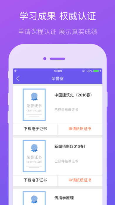 证书展示模块——荣誉室:在这里可以看到学习者在考试中达标后获得的证书,MOOC证书可以轻松“随身携带”!