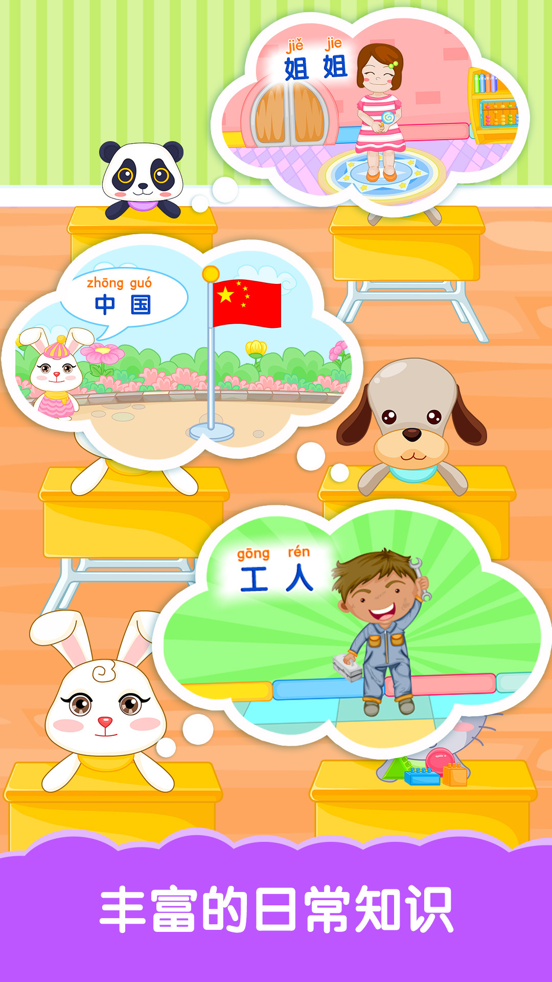 2、根据儿童日常接触的事物,编排了家庭成员、国旗、少数民族、水果以及职业等各种内容,拓展宝宝的眼界;