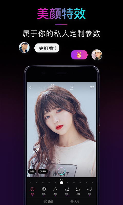 【智能美颜】细致的人像模式,从美肤、肤色、瘦脸、小脸、额头、颧骨、大眼、亮眼、祛眼袋、眼角、瘦鼻、鼻梁、鼻子立体、丰唇、下巴、嘴型等进行颜值微调,让你拍出颜值高光。