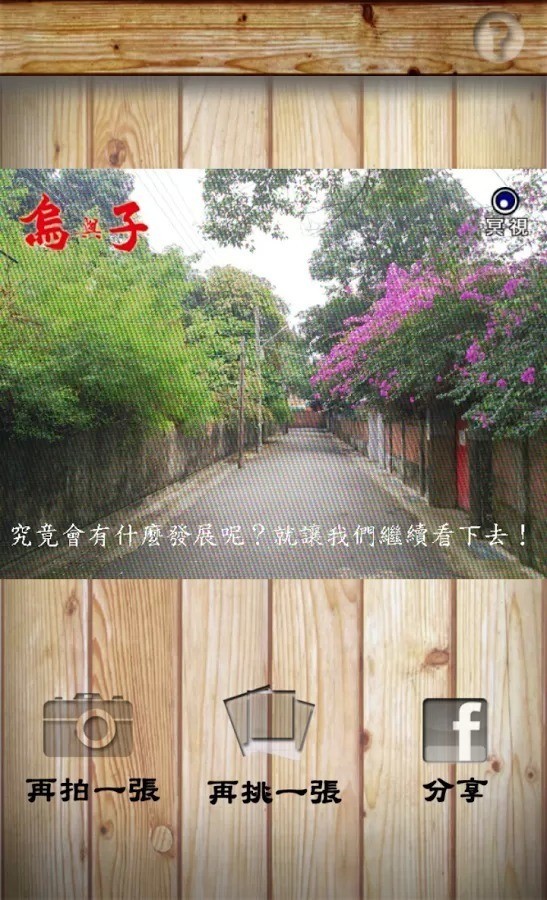 目前,乡土剧相机的仅供分享至 Facebook。按下分享页面的右上角的问号图示,会出现 App 开发者的创作小故事。
