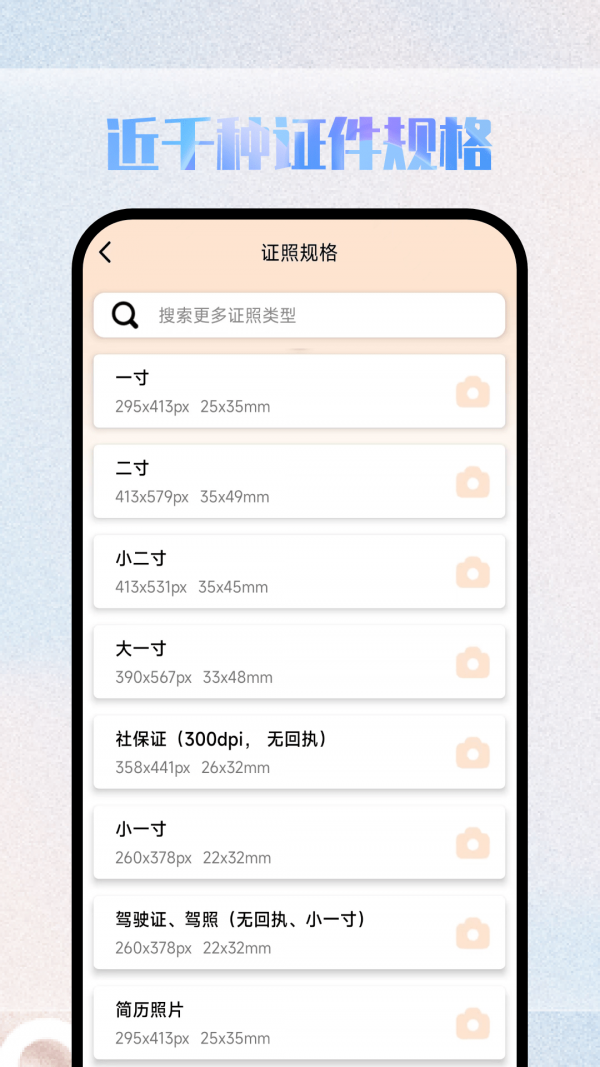 一寸、二寸等常用寸照;专升本、成人自考等学历考试;英语四六级、普通话水平测试等语言考试;计算机等级考试;教师资格证、驾驶证、导游证等职业资格;泰国签证、日本签证等多个国家旅游签证;公务员、事业单位考试;社保证、身份证等身份证件;还可以拍摄结婚登记照、职业形象半身照,满足证件照制作的所有场景。