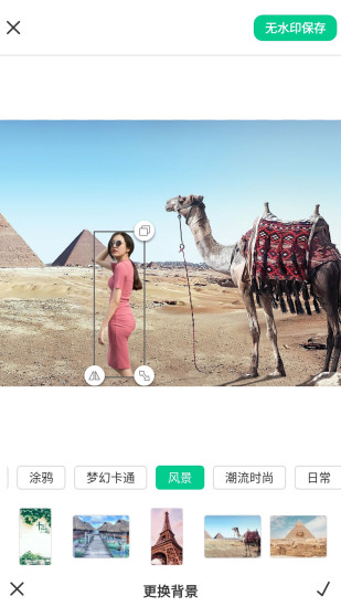 强大的图像合成功能。你可使用内置的背景图模板,或选取相册图片自定义添加背景图片,