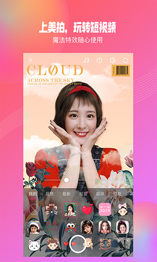 为广大粉丝们提供最新的魔法自拍特效。你在直播的时候也能使用魔法自拍表情啦,可随着脸部一起动,一秒变萌超Q哦。美拍相机app可将魔法自拍表情送给正在直播的TA,把TA装扮成你喜欢的样子!