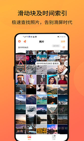 1、采用时间轴,可触摸滑动块搭配悬浮时间提示,拖动滑动块即可一秒找到“那天”的照片,告别滑屏时代;