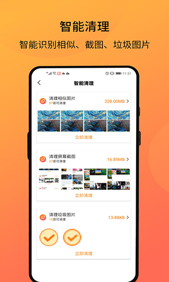 2、相册智能清理全盘扫描相似图片、屏幕截图、垃圾图片,让您的内存快速释放,手机更顺畅;