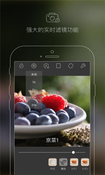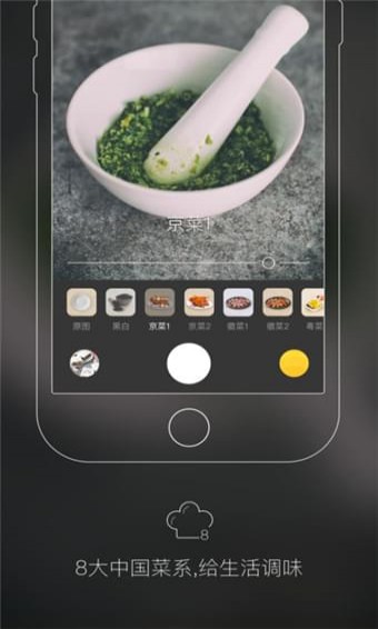 《调味相机》的设计师专门为您调教了多种适用于食物照片的滤镜选项,并且它是实时的,您可以在拍摄的过程中就能看的照片拍出来之后的样子,所见即所得。
