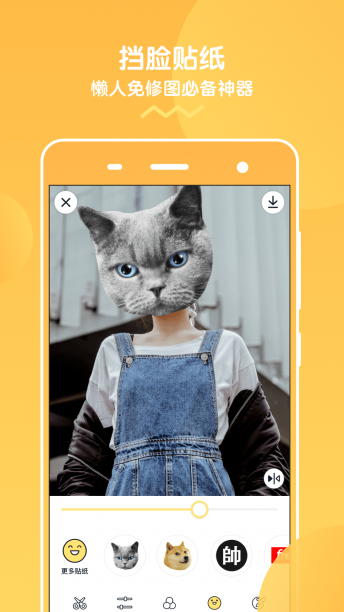 挡脸相机app是一款优秀的手机相机软件,拥有海量超百搭贴纸素材,精心挑选各种Emoji、动物、潮流文字、脸部装饰等不同贴纸素材,满足你任何的挡脸需求;贴纸大小位置与透明度都可以随意调整,完美地与你的照片搭配。