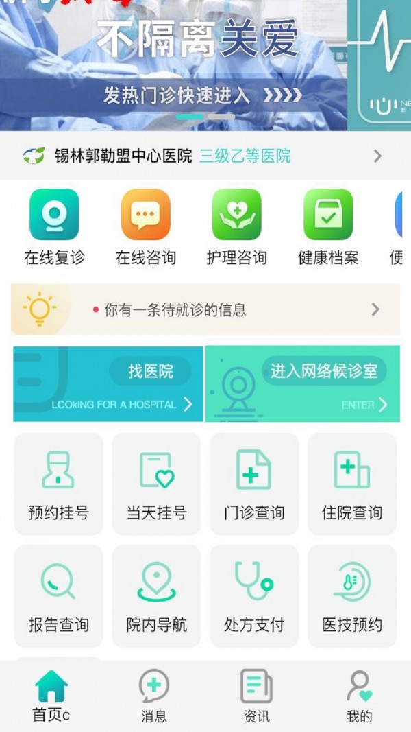 用锡盟中心医院app实现掌上预约挂号,短信凭证高效就诊;