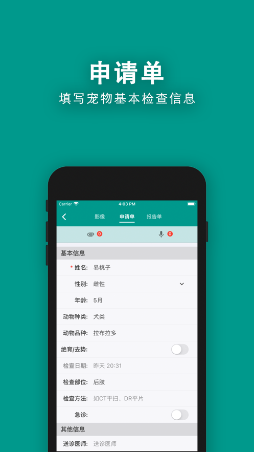 4、检查申请单功能,除可填写动物检查基本信息外,还可以拍照纸质申请单上传或录制一段语音;