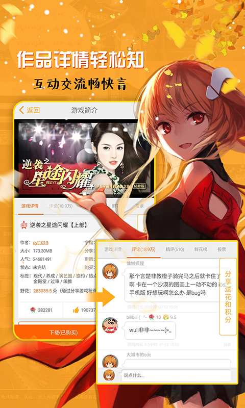 互动式阅读体验。多种结局可供选择,还可与作者互动,影响剧情走向,更有可能客串成为剧中角色。