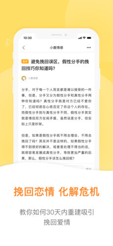 小鹿情感:全程护航835万用户的恋爱征途,让爱得偿所愿!超过800万男孩使用,帮助男生解决如何追女孩、找到女朋友、挽救破裂的婚姻、爱情,以及如何跟女孩聊天、约会恋爱、搭讪表白等情感问题。让每一个情感遭遇问题的家庭和个人都得到满意的结果!