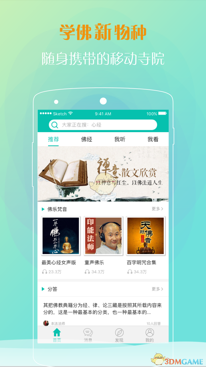 2、选择佛经开始阅读学习,在线收听佛乐梵音。查看最新问答资源,在线发布问题寻求答案。