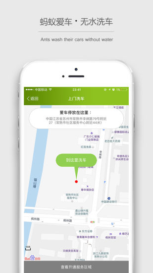 2、【蚂蚁爱车】使用国家认证专利无水洗车液,无需其他冗杂洗车设备,仅需500ml洗车液就能轻松洗净整辆车,洗车快速、洁净、舒心,带来上门洗车服务新标准,用户也可在【蚂蚁爱车全国品牌连锁店】享受完善的高标准汽车后市场服务,并结合中国传统紫砂,在店内环境氛围,服务体验上为客户带来全新的精神享受;