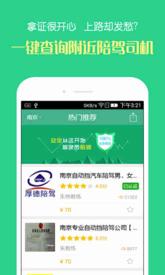 1、热门推荐:快速定位+认证推荐,及时为您挑选优秀的陪驾教练;