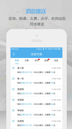 4、消息推送:购课、欠费、点评、反馈、机构动态、咨询,同步推送;