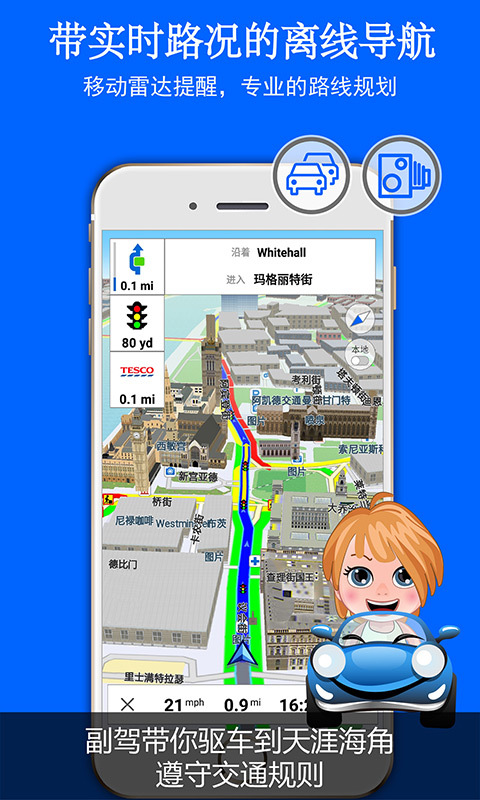 旅图为你打造梦想中的专属副驾。简单易懂的3D路口放大图、测速雷达、限速、交通标志、路口车道提示等,100%全球覆盖!如果你打开网络连接,旅图会提示给你移动测速点,交通拥堵,道路事故照片,实时路况等在线信息;并且提供符合实际、最快的路径计算。根据城市、洲际公路、高速公路,山区道路,农村道路等不同道路类别提供不同的导航体验。