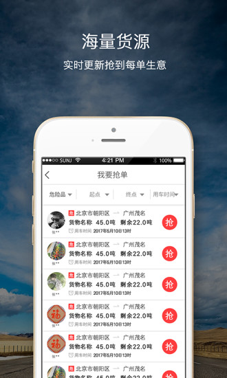 2、我要抢单:可按起始地、目的地、时间、类型查找货源;