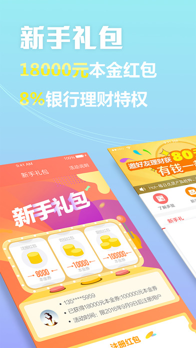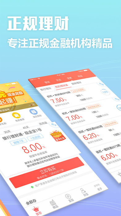 1、银行理财产品:1元起跨行购,8%银行理财产品天天秒杀,当天购买次日计息,提现当日到账。