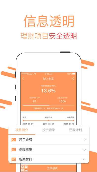 专注于互联网理财,为广大投资爱好者提供丰富的理财、投资产品,严格遵守国家各项政策,努力打造一个合规的p2p金融理财平台,是家庭理财、个人理财的投资理财管家,投资者随时随地都可以投资赚钱的手机理财软件,实现轻松记账的工资理财工具,方便简单的口袋理财投资平台。