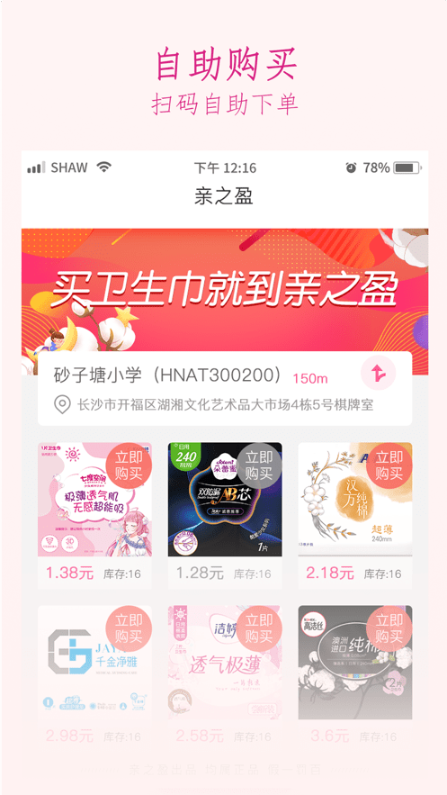 亲之盈APP由湖南省福鸿科贸有限公司开发,是一款针对女性量身定做的软件,为女性的生活和健康提供便利,“亲之盈”卫生巾自动售卖机,24小时持续关注女性健康,已签约合作品牌包括ABC、七度空间、千金净雅、洁柔等。
