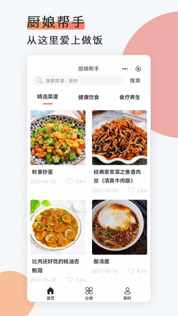 厨娘帮手app是一款大家都可以学习各种菜谱的软件,让大家都可以成为大厨哦,喜欢做菜的小伙伴们都可以在这里多多的研究,可以发现很多好玩的一些菜式,真的非常多的一些菜谱学习,都是免费的,大家想要学习的各种菜式都可以手把手教导大家!