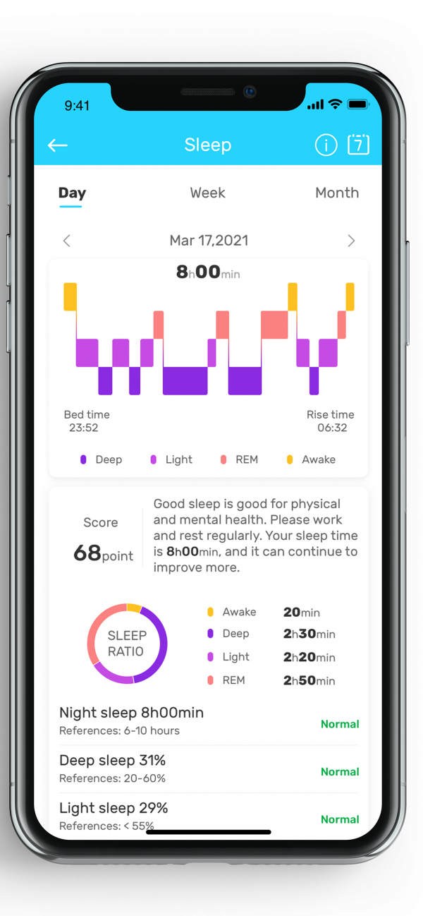 图文展示每天的深睡时间、浅睡时间和清醒次数,统计每周、每月的睡眠趋势。