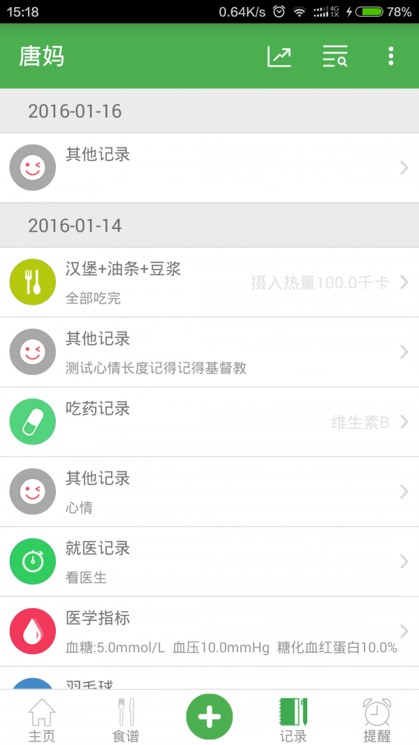 4.提醒,可以添加运动、吃药、测量等提醒。
