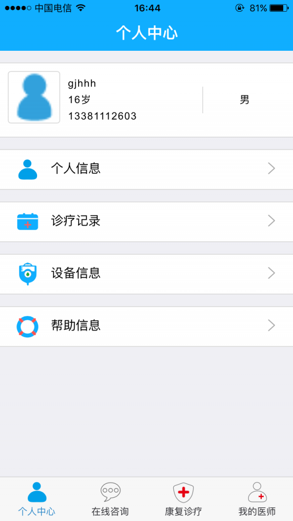 本APP软件包括患者注册,个人信息完善提交,患者病历完善、提交,诊疗设备购买,康复数据上传,指导方案下载,康复在线咨询等功能。