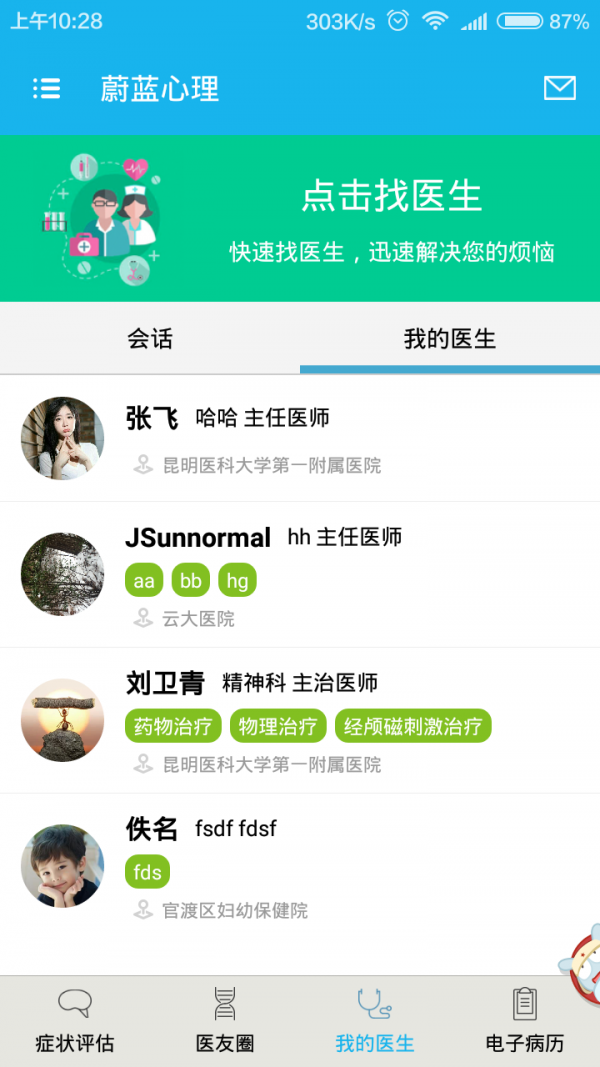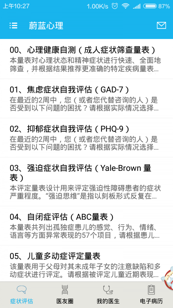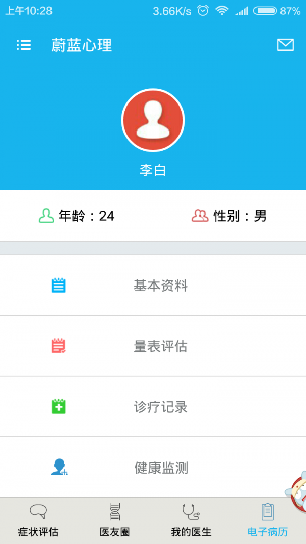 这款软件可以提供用药情况,量表记录,方便医生及时查看。这蔚蓝心理app是一款权威的医患应用app,诊疗记录等功能帮助患者记录自己的健康每一天。为医生提供患者的各种资料查询,便于更好的对患者进行诊疗和沟通。