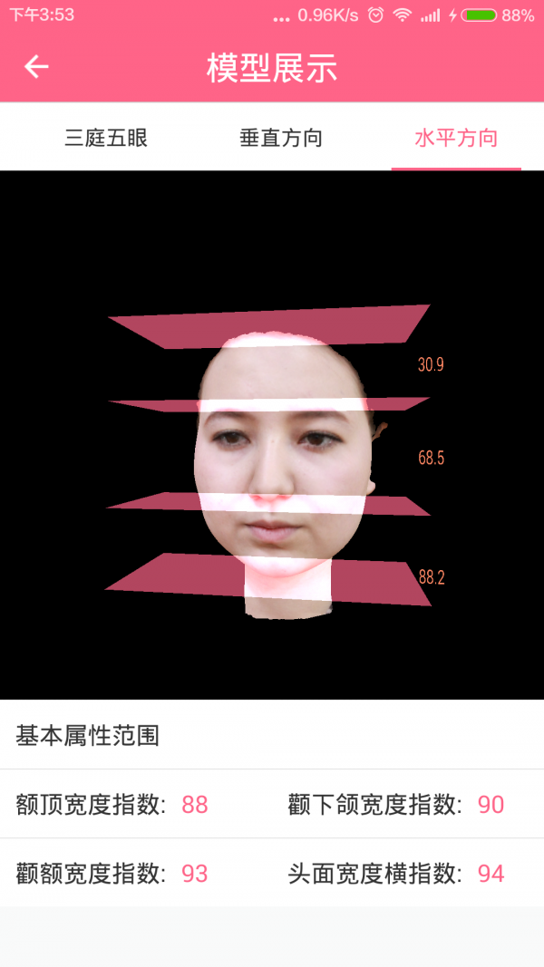 - 展示三种人脸的比例关系(三庭五眼、四高三低和对称分析)